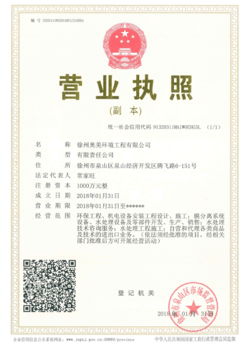 為更好的開拓公司業(yè)務(wù),優(yōu)化公司的戰(zhàn)略布局,增強(qiáng)公司盈利能力,進(jìn)一步提高公司綜合競(jìng)爭(zhēng)力,公司與徐州泉山經(jīng)濟(jì)開發(fā)區(qū)投資發(fā)展有限公司聯(lián)合成立徐州奧美環(huán)境工程有限公司。近日,該控股子公司已完成工商注冊(cè)登記手續(xù),并取得徐州市泉山區(qū)市場(chǎng)監(jiān)管局核發(fā)的《營(yíng)業(yè)執(zhí)照》,2018奧美環(huán)境進(jìn)入開枝散葉階段!